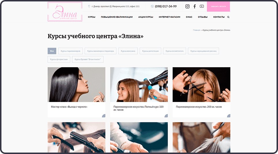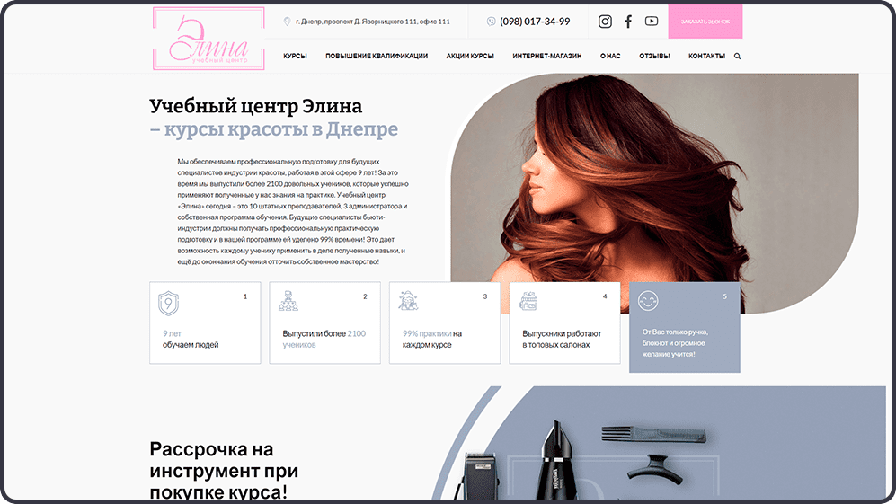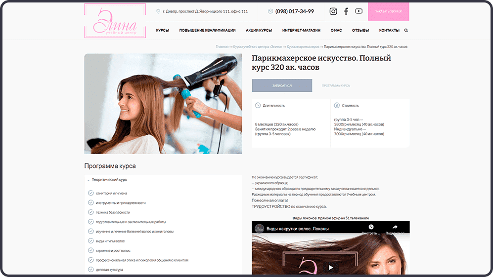 Легкий дизайн, оформленный в спокойных тонах, не перегруженный информацией, но позволяющий быстро получить необходимые сведения об обучающих программах. Грамотное расположение анимационных элементов, форм обратной связи позволяет повысить заинтересованность посетителей в предлагаемых школой красоты продуктах, сформировать позитивное восприятие компании и её услуг, а, следовательно, повысить конверсию сайта.