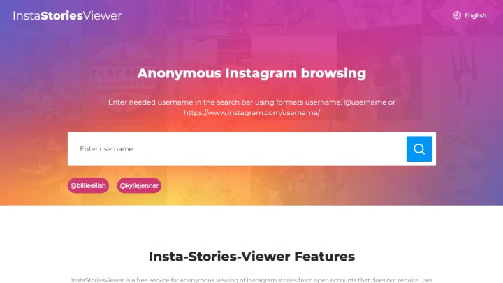 InstaStoriesViewer – ще один інструмент для анонімного перегляду історій в онлайн-режимі. Він також підтримує 7 мов, включно з англійською та російською. Можливості повністю повторюють функціонал попереднього сервісу: