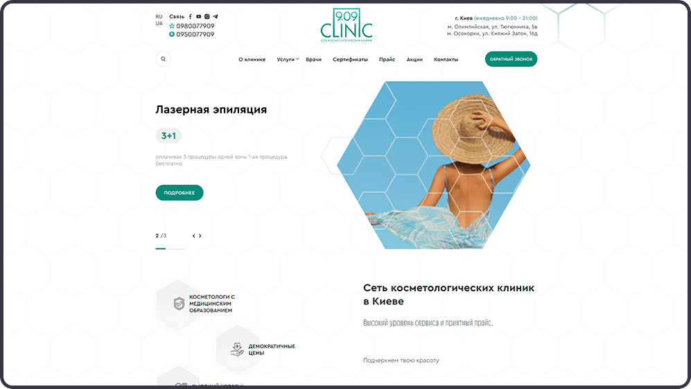 Максимально відображає специфіку діяльності клініки 9.09 Clinic, легкий і не переобтяжений дизайн, привабливий як для користувачів, так і для пошукових систем. Поєднання приємної оку спокійної колірної гами з лаконічною подачею важливої інформації і корисним графічним контентом формує позитивне сприйняття компанії та лояльне ставлення до послуг, що надаються. В кінцевому підсумку це працює на створення репутації, зростання трафіку, залучення додаткових клієнтів.