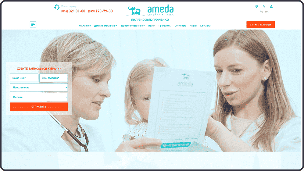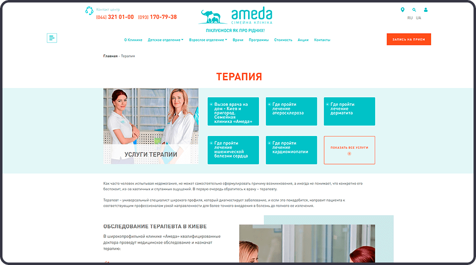 Максимально інформативний, корисний для користувачів сайт, де грамотно структуровано викладено повну інформацію про діяльність клініки Ameda, ключові напрямки, послуги, що надаються, штат лікарів. Дизайн відрізняється стриманістю, лаконічністю, при високій функціональності. Він передбачає можливість здійснення дій (вибір фахівця, запис на прийом, замовлення зворотного дзвінка і т.д.) в кілька кліків, за зрозумілою та простою для користувача схемою.