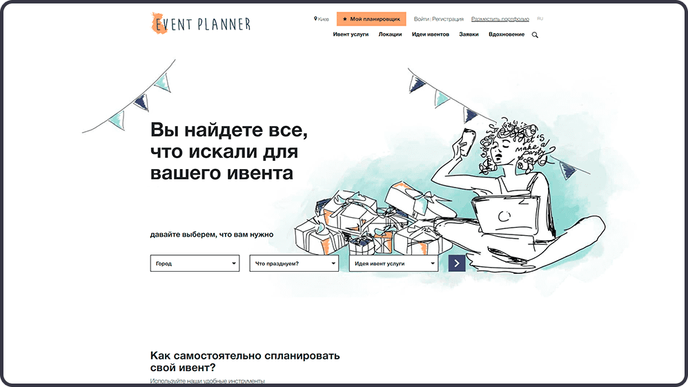 Eventplanner – це сучасний і затишний простір для тих, хто так чи інакше пов’язаний з організацією івентів. Тут є всі зручності для пошуку і комунікації. Дизайн і інтерфейс сайту розташовують, а також викликають довіру у користувачів. Багатофункціональність – це перевага, яке замінює клієнтам інші сервіси.
