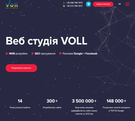 Веб студія VOLL займає одну з лідируючих позицій у сегменті створення та просування сайтів, при цьому працюючи із замовниками по всій Україні та за її межами. До сфери діяльності входить робота на веб-ресурсах будь-якої специфіки, масштабу та спрямованості від невеликих інтернет-магазинів до великих інформаційних порталів. Послуги фахівців VOLL торкаються всіх аспектів функціонування сайту від створення структури до розробки дизайну. За допомогою веб-студії було успішно реалізовано не один десяток проектів із виведення у ТОП видачі Google.